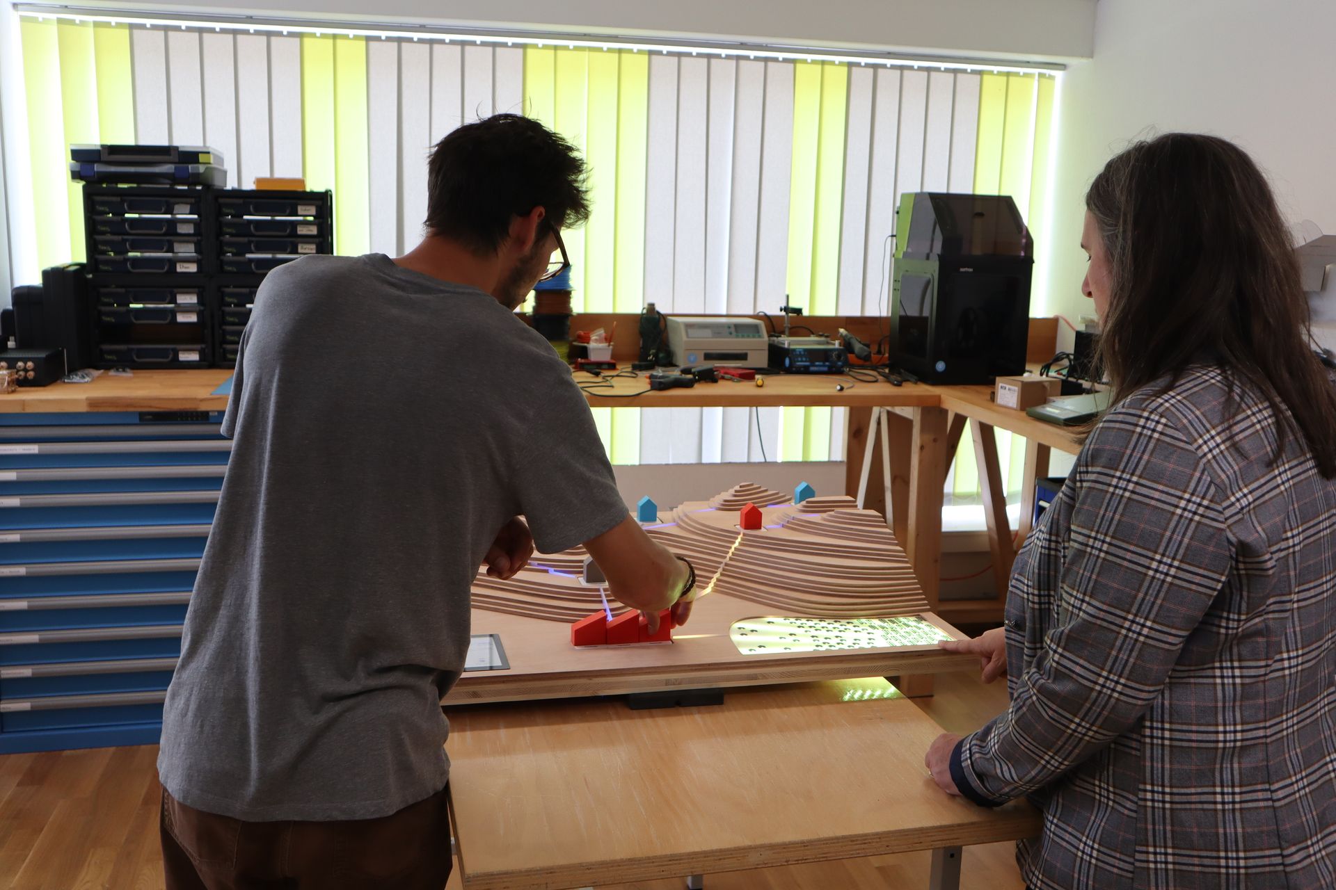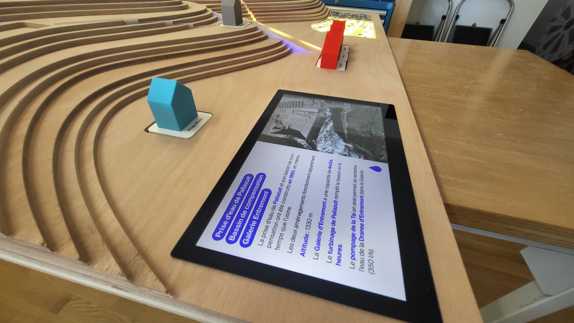 Pas de boutons ou d'écrans tactile, cette maquette en bois topologique intègre de façon discrète de l'électronique et des lumière pour créer une expérience interactive unique. En plaçant les sources et les usines au bon endroit, la région d'Orsières et la ville de Martigny s'illuminent. L'intégration de la technologie RFID permet de détecter si les bâtiments sont à leur bonne position sans capteur apparent, donnant à l'utilisateur une interaction tangible et engageante.